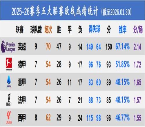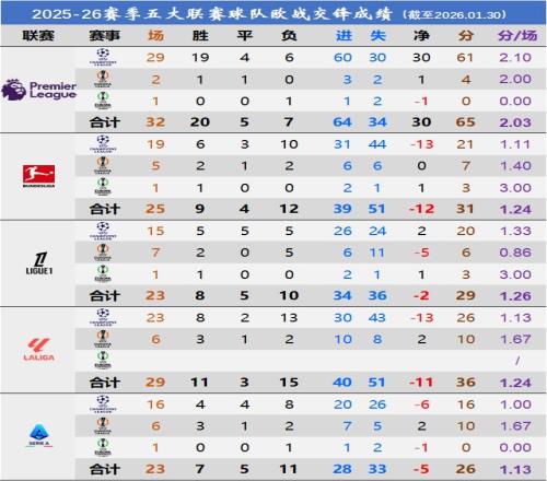 再来看看五大联赛球队之间的内战情况。